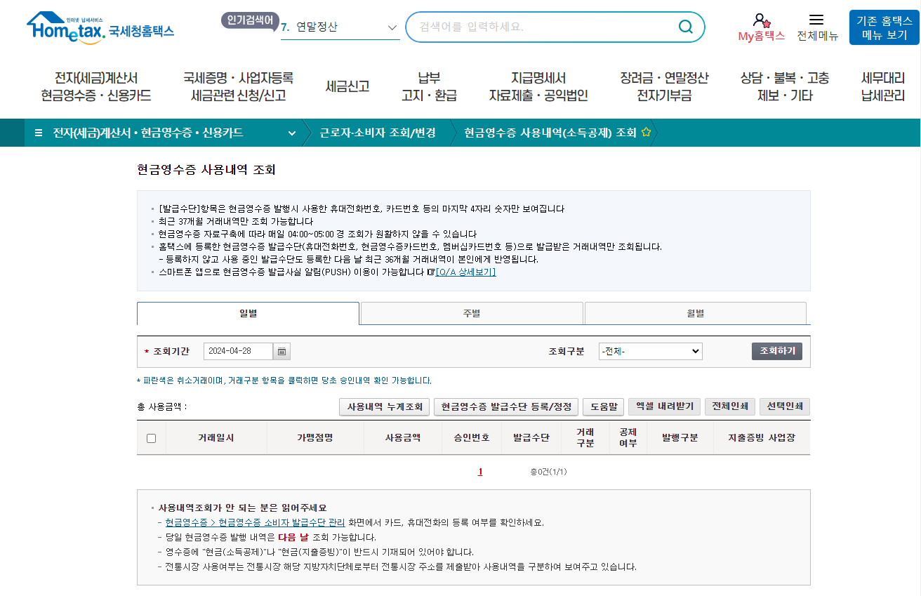 (5) 당일 등록한 현금영수증은 국세청에 등록되는데 하루정도 시간이 걸릴 수 있어 다음 날 조회가 가능합니다.