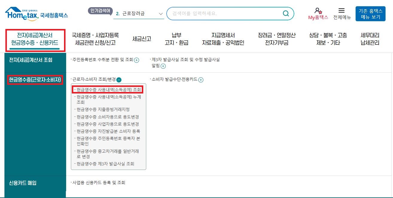 (3) 홈택스 메인화면 상단 '전자(세금) 계산서 현금영수증 신용카드' > '현금영수증(근로자소비자) > '현금영수증 사용내역 조회' 순서대로 접속합니다.
