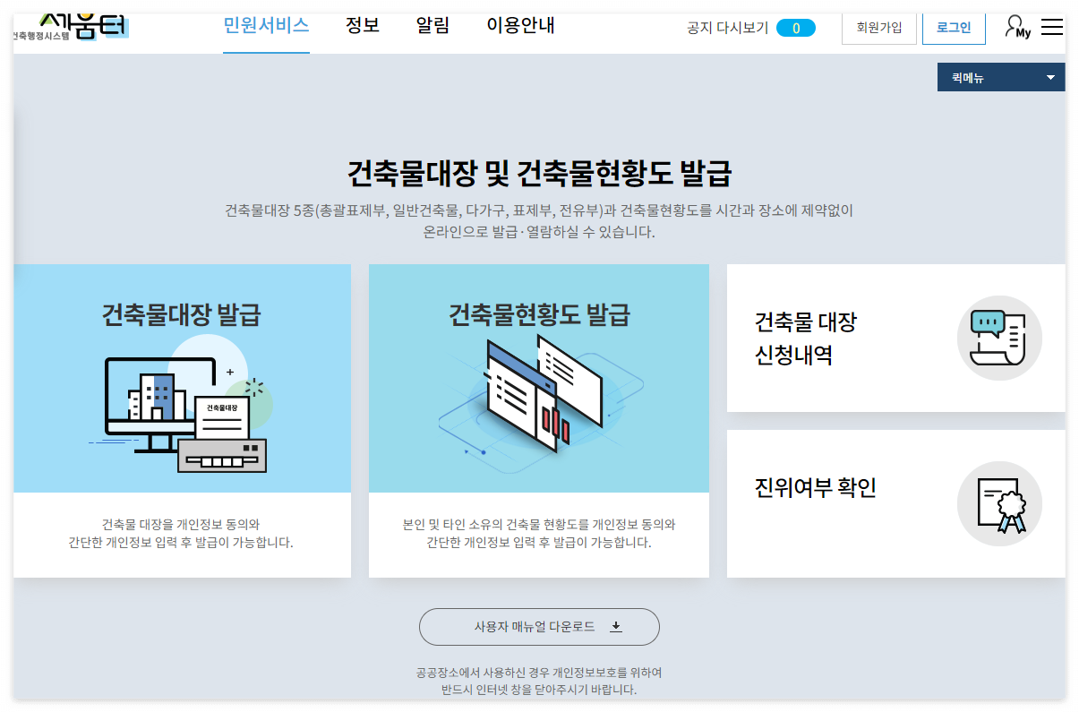 (2) 건축 행정업무를 할 수 있는 세움터에서도 무료 열람이 가능합니다.