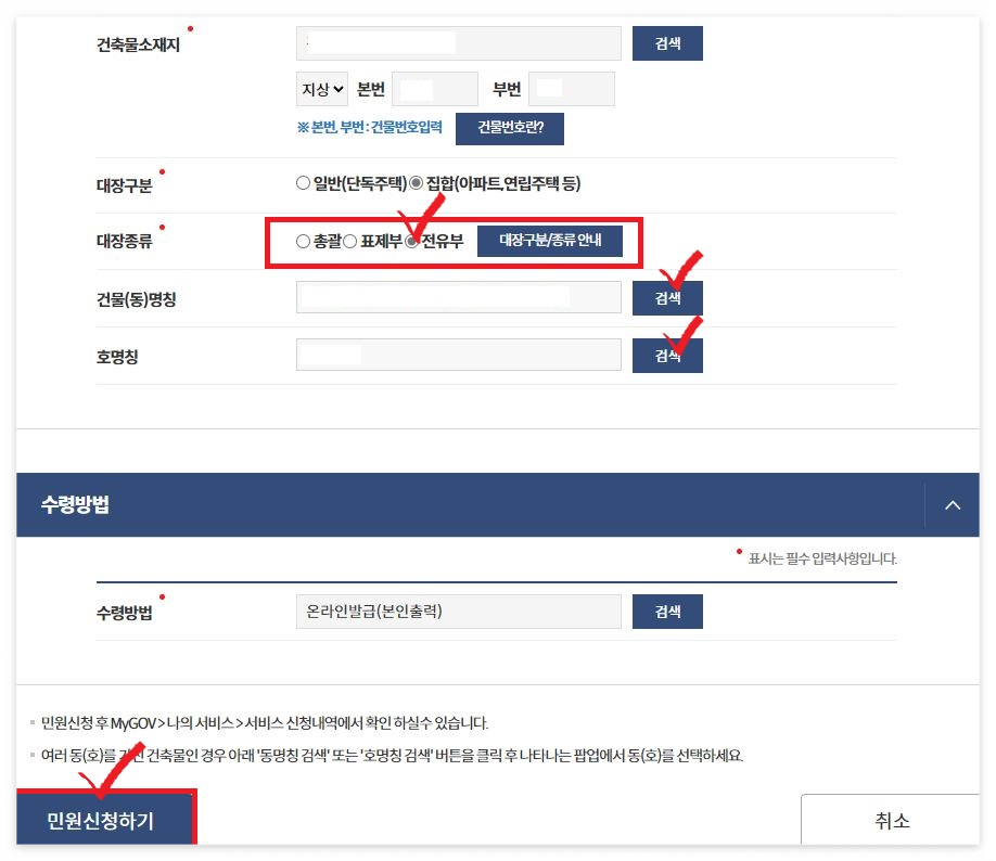 (아파트 경우 대장구분 집합, 전유부를 선택하면 동과 호수까지 검색할 수 있습니다)
