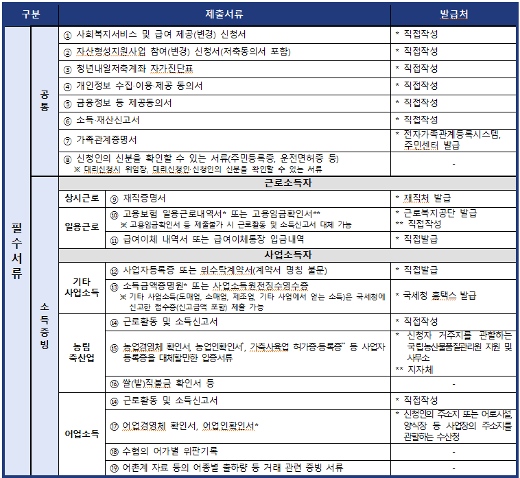 신청을 위해 필수서류 또는 해당자에게만 필요한 서류를 준비하셔야 다시 방문하는 일 없이 한 번에 접수하실 수 있습니다.