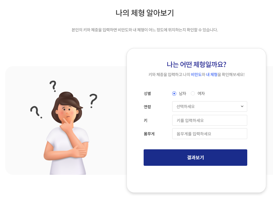 - 체형 분류 : 자신의 키와 몸무게를 입력하여 체형 그룹을 확인하고, 해당 그룹의 평균적인 신체 치수를 비교할 수 있습니다.