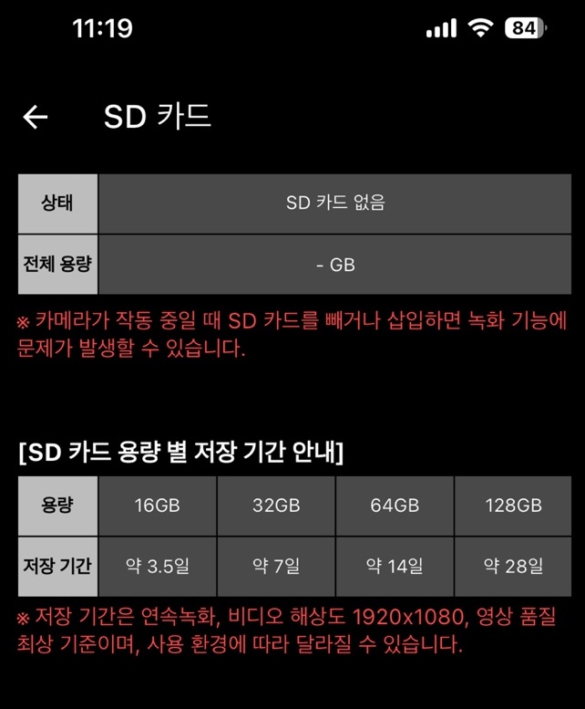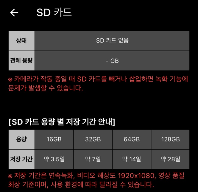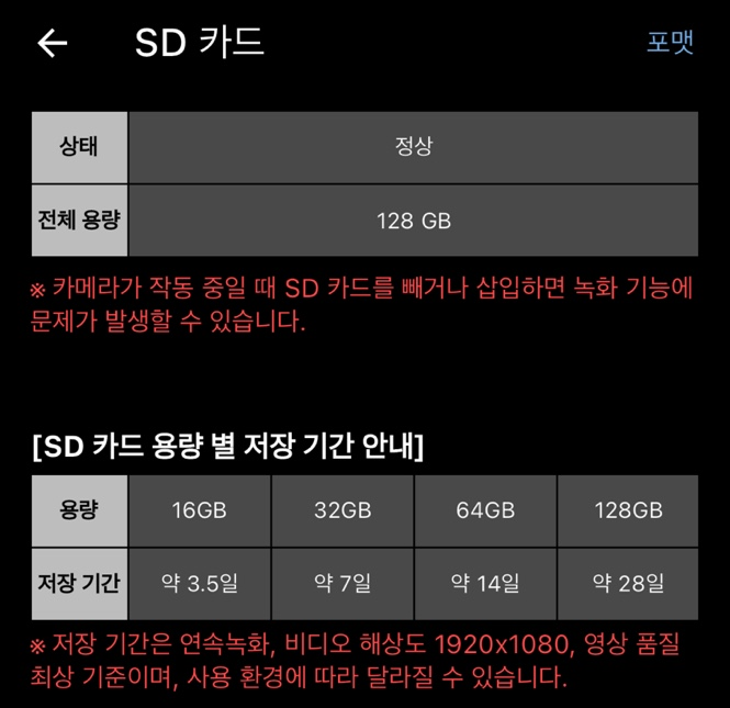 128G SD카드를 별도로 구매하여 바로 사용하기 위해 홈캠전원을 끄고 넣었지만,