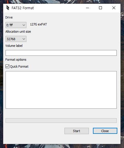 (4) 해당 프로그램 실행하여 인식되어 있는 SD카드 드라이브를 선택 후 start를 누르면 포맷이 완료됩니다.