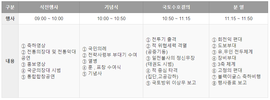 (1) 기념식 : 09:00 ~ 11:50 / 성남 서울공항에서 진행됩니다.