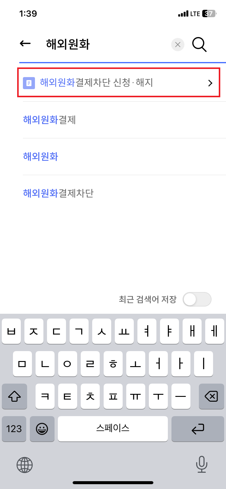 (4) 로그인 후 상단 검색으로 해외원화차단서비스 검색해 줍니다.