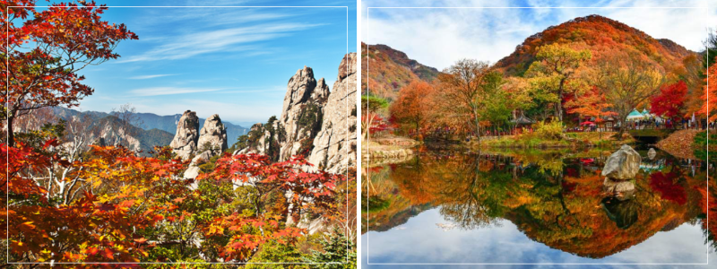 - 울긋불긋 물든 단풍과 웅장한 설악산의 풍경이 어우러져 환상적인 비경을 선사합니다. 특히, 설악산 국립공원의 단풍은 국내 최고의 절경으로 손꼽히는 곳입니다.