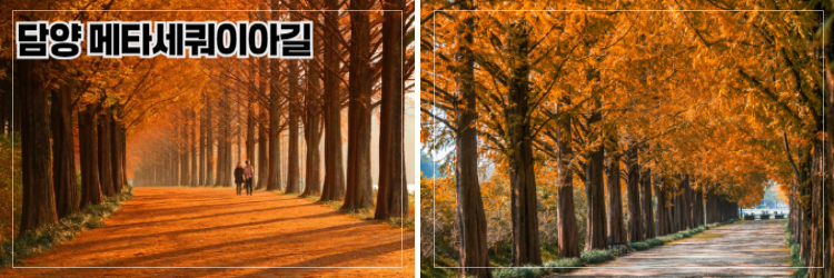 담양 메타세쿼이아길은 쭉 뻗은 메타세쿼이아 나무들이 만들어내는 웅장한 풍경이 인상적인 곳입니다. 가을에는 노랗게 물든 은행잎과 초록빛 메타세쿼이아 잎이 어우러져 환상적인 풍경을 연출합니다. 걷거나 자전거를 타며 여유로운 시간을 보내기에 좋습니다.