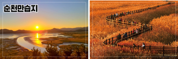 순천만은 칠면초 붉은 융단과 갈대밭이 어우러져 가을의 정취를 물씬 풍기는 곳입니다. 갯벌 체험, 자전거 투어, 탐방로 산책 등 다양한 즐길 거리가 마련되어 있어 지루할 틈이 없습니다. 특히, 낙조 무렵의 순천만은 붉게 물든 하늘과 갈대밭이 어우러져 한 폭의 그림 같은 풍경을 선사합니다.