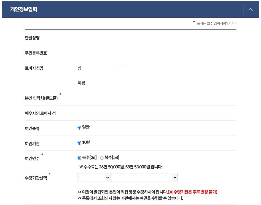 (4) 개인정보를 입력한 뒤 여권의 종류, 기간, 수령기관을 선택합니다. 온라인 신청 시 반드시 본인 방문 수령해야 하며, 수령기관은 변경불가능하니 꼭 확인 바랍니다.