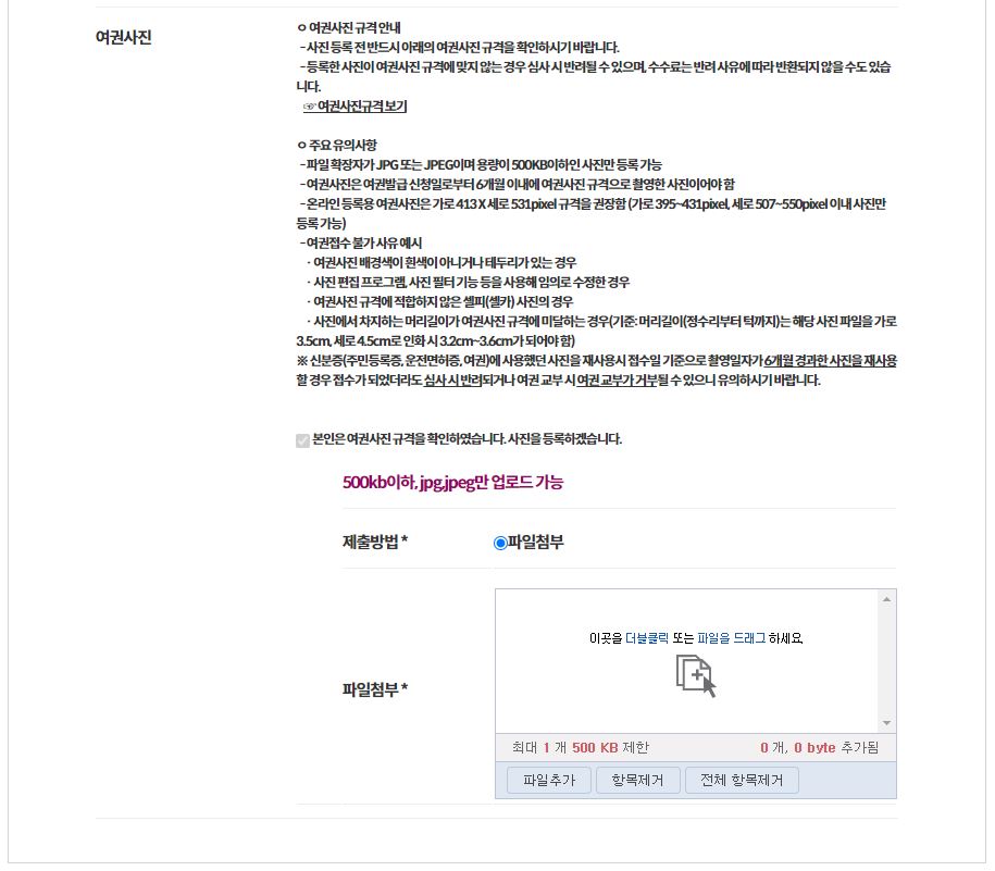 (5) 준비한 여권사진을 드래그 또는 파일추가로 여권사진을 업로드합니다. 여권사진은 사진관에서 촬영한 사진을 사용하면 문제는 없습니다.