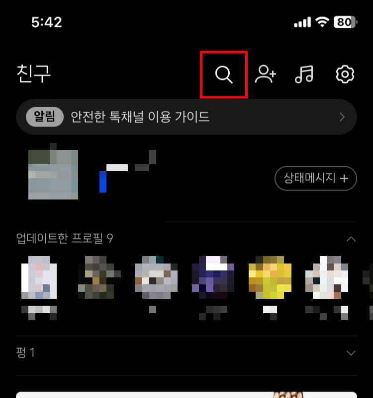 (1)먼저 친구목록을 볼 수 있는 창에서 상부 돋보기 모양을 클릭해 줍니다.
