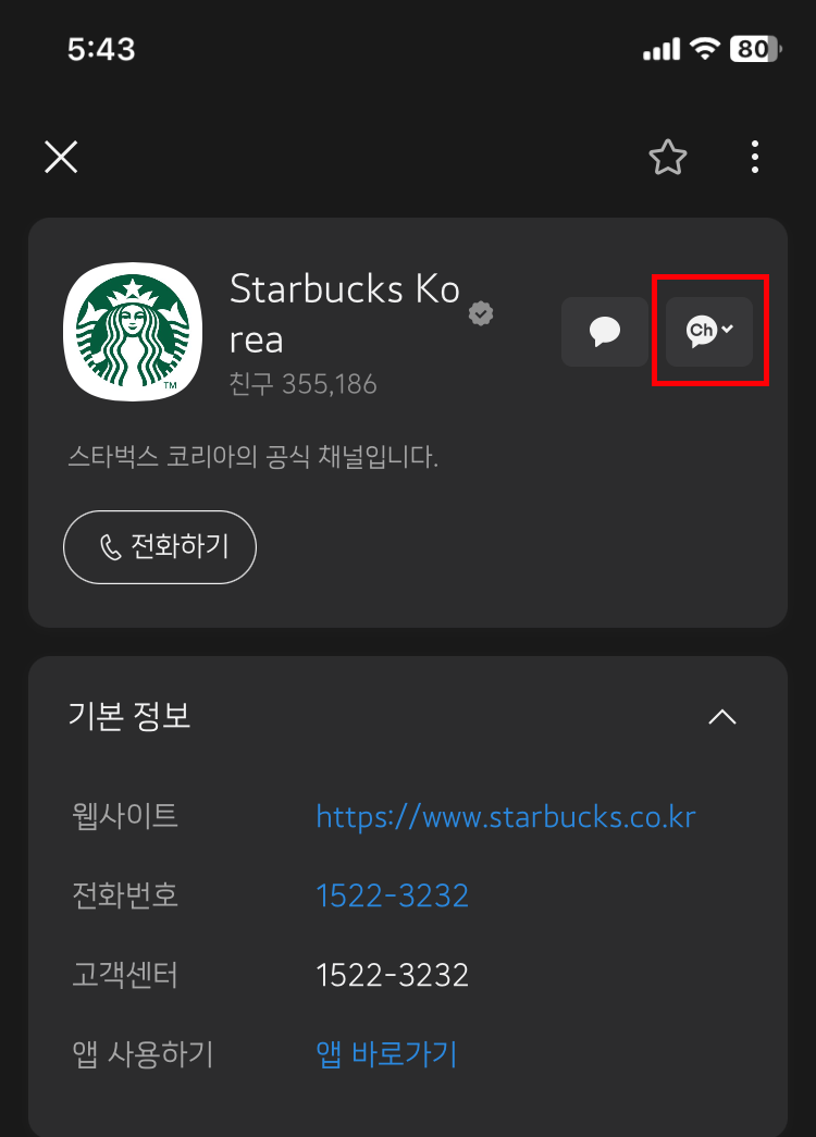 (2) 검색창이 뜨게 되면 추가하고 싶은 플러스 친구의 상호명 또는 이름을 적고 검색합니다. 만약에 검색을 해도 뜨지 않는다면 검색하는 상호명 또는 이름을 다시 한번 확인해 주세요.(예를 들어 스타벅스로 검색을 해보았습니다.)