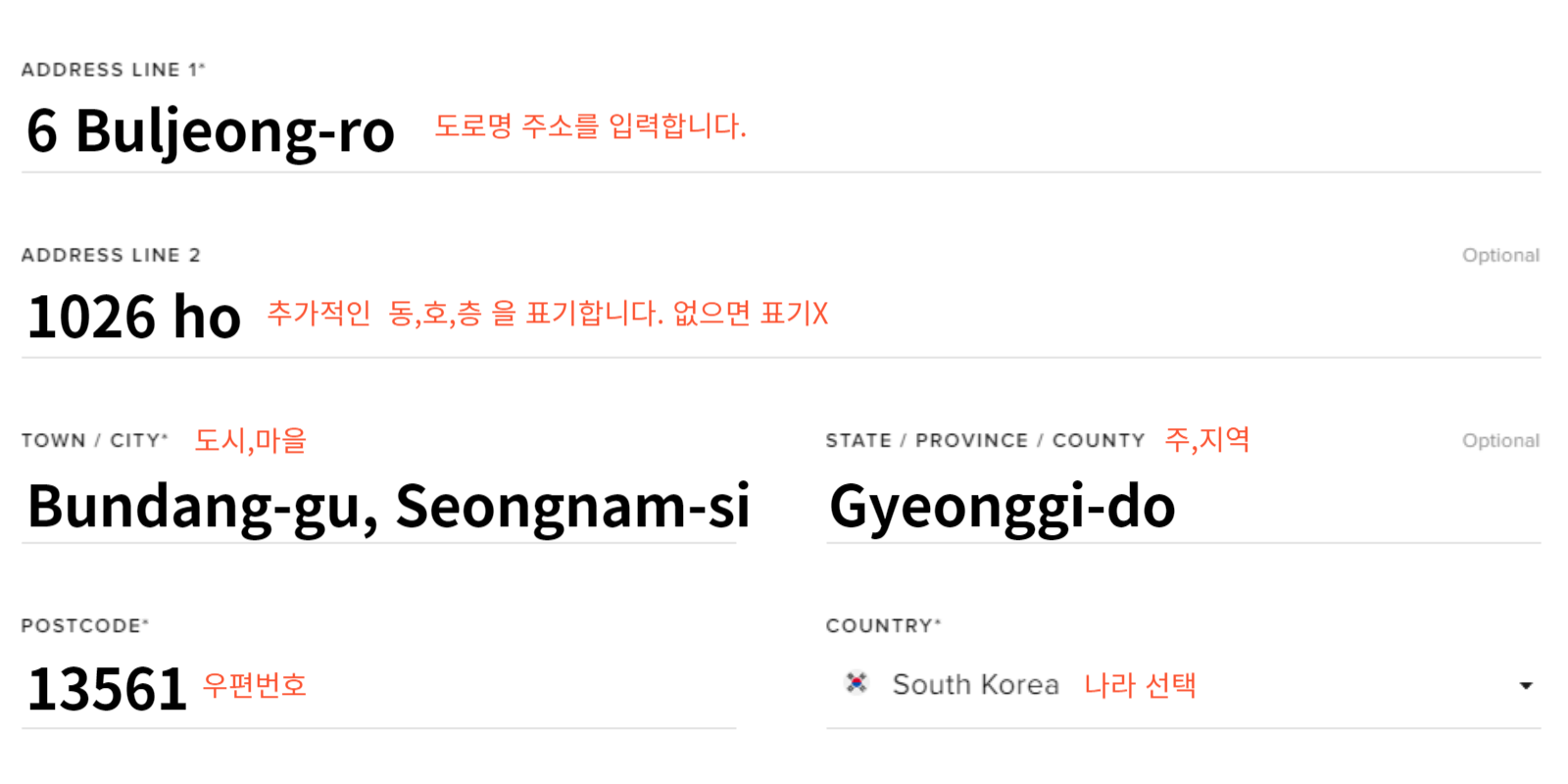 (2) ADDRESS LINE2 부분에 추가적인 동, 호, 층수를 작성하고 없으면 따로 표기하지 않아도 무방합니다.