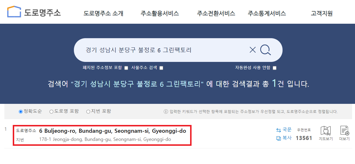(2) 메인화면 검색란에 변환하고 싶은 주소를 입력 후 검색합니다.