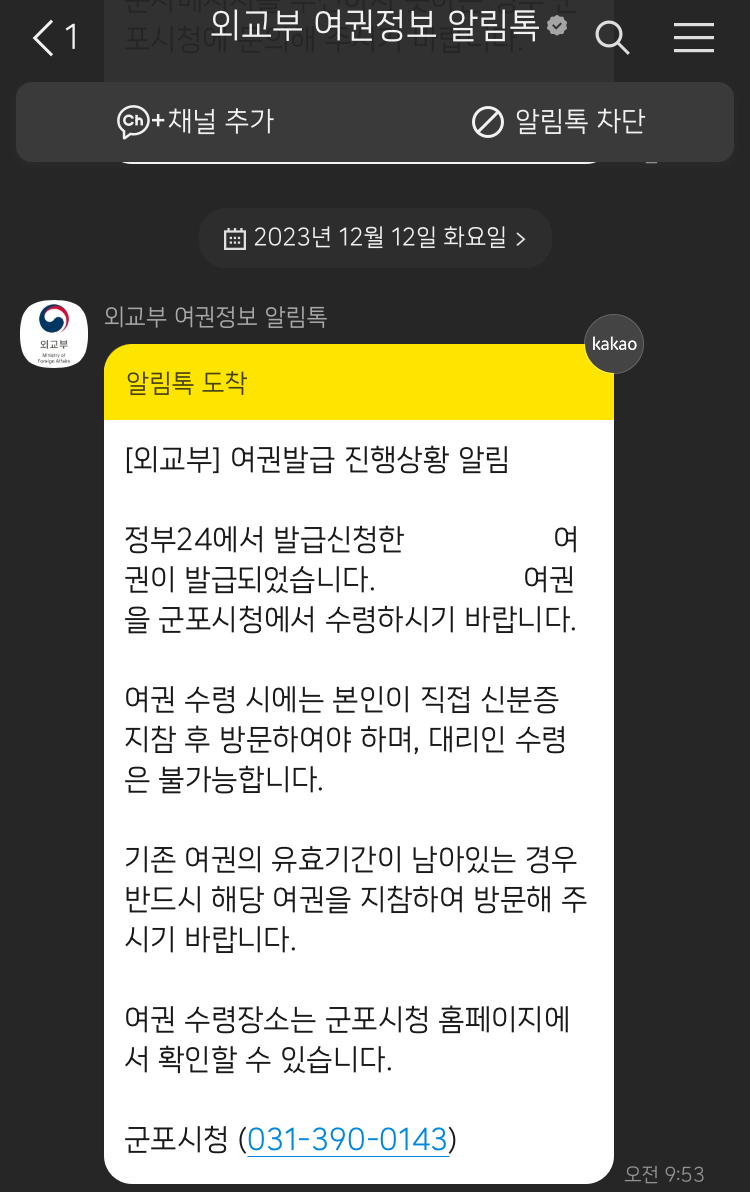 여권 재발급 온라인 신청은 23년 12월5일 신청하였고 7일 후 23년 12월 12일 문자와 카카오톡을 통해 여권이 발권되어 수령할 수 있다는 연락을 받았다.