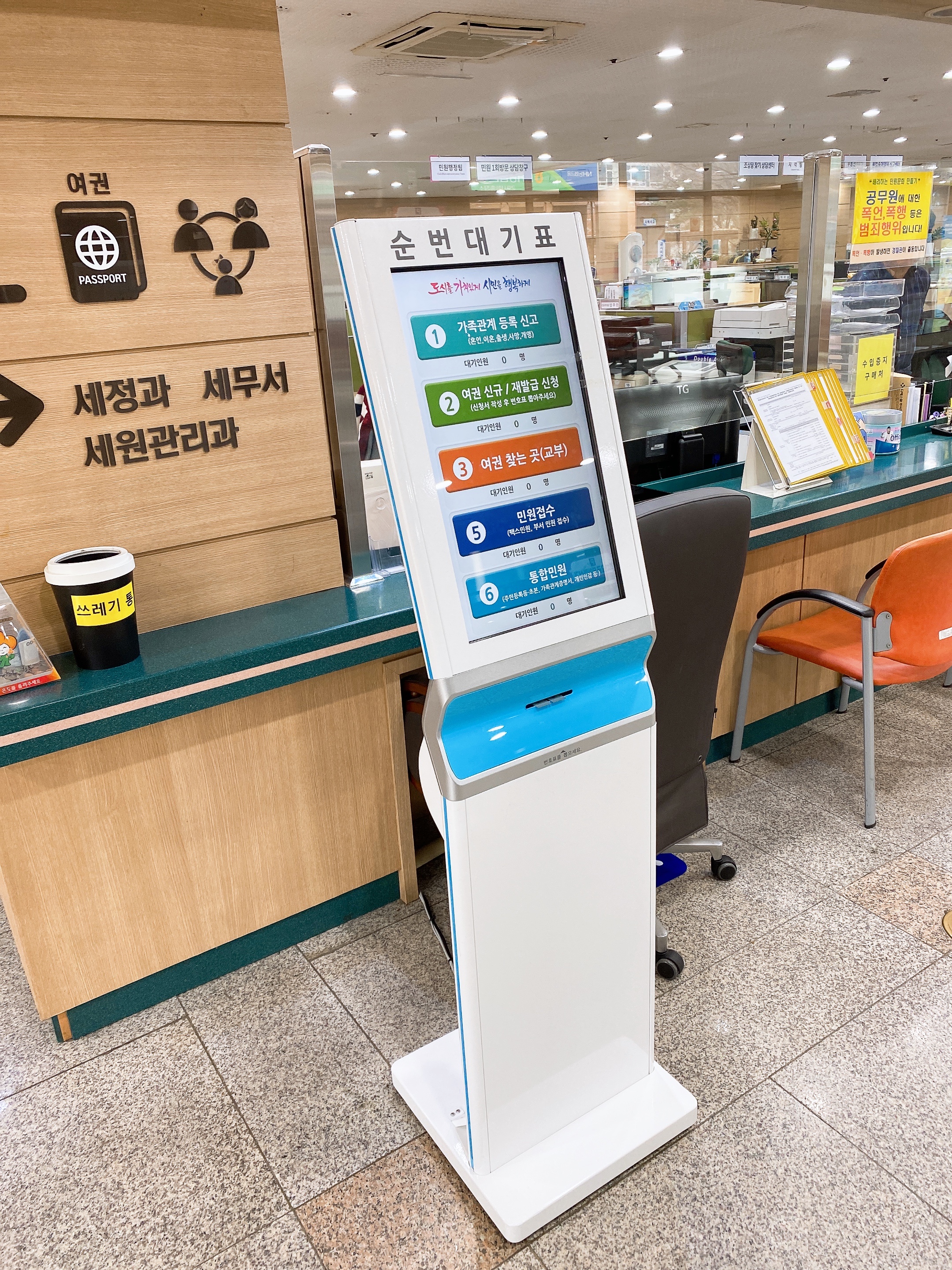민원 봉사실에 들어가면 정면에 3번 여권찾는곳(교부)를 선택하여 번호표를 받습니다.