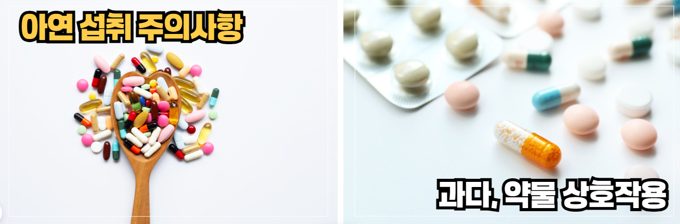 - 과다 섭취 : 아연은 필수 미네랄이지만, 과다 섭취하면 구리 흡수를 방해하거나, 위장 장애를 일으킬 수 있습니다.