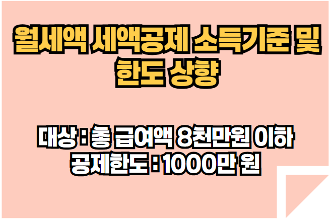 - 월세액 세액공제 소득기준 및 한도 : 소득기준은 총 급여액 7천만 원 이하에서 8천만 원 이하로, 공제한도는 750만 원에서 1000만 원으로 상향