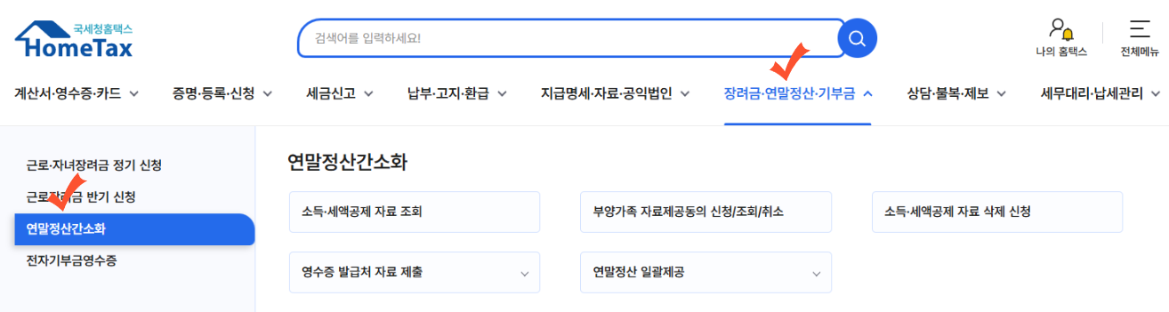 2️⃣편리한 연말정산 메뉴 선택: ‘장려금·연말정산·전자기부금’ 메뉴에서 ‘편리한 연말정산’을 클릭합니다.