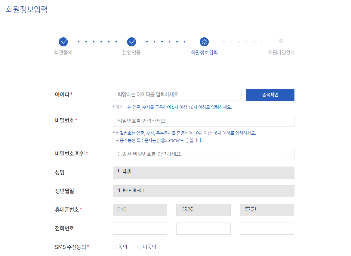 (4) 본인인증 진행 후 사용할 아이디와 비밀번호 및 회원정보를 입력해 줍니다.