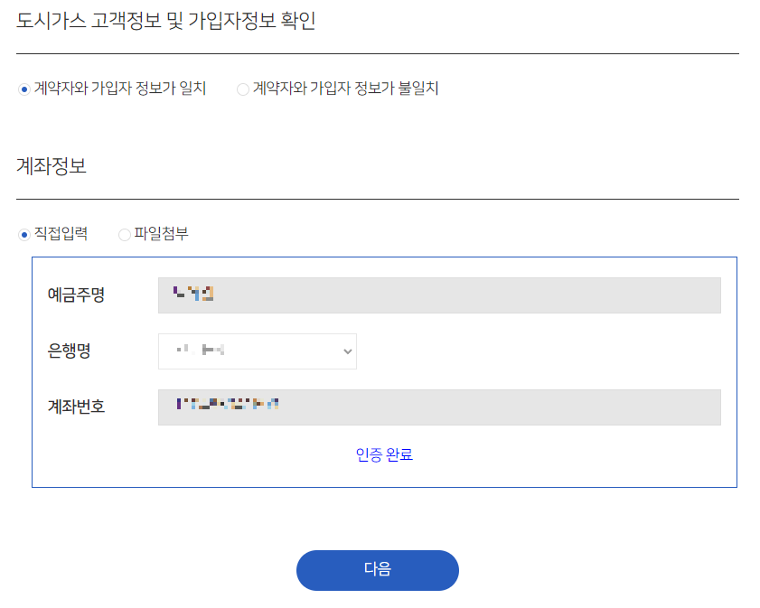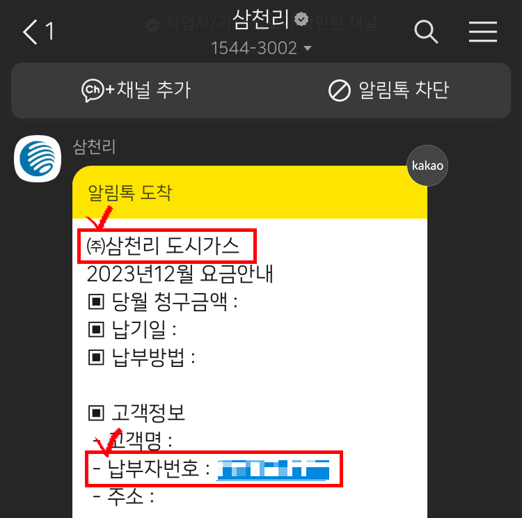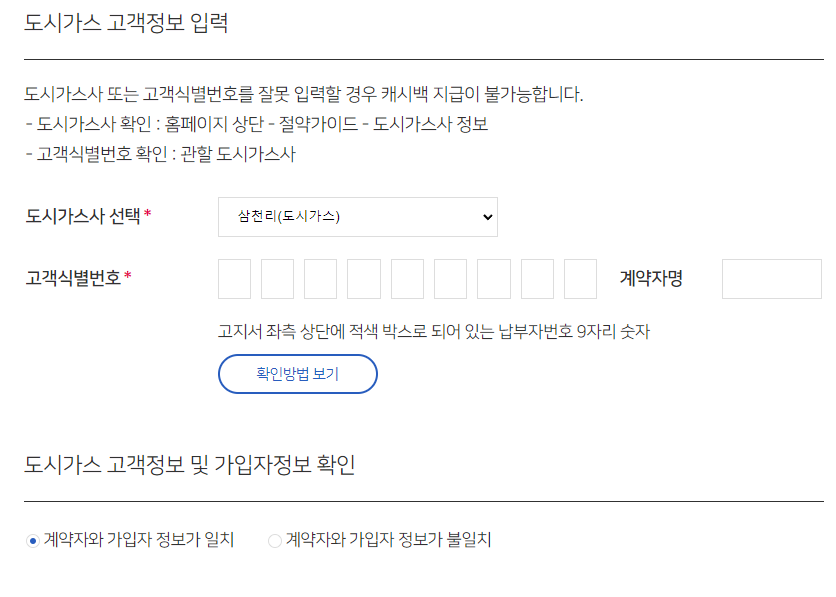 (5) 다음으로 도시가스 고객정보 입력이 필요합니다. 도시가스 고지서 또는 문자나 카카오톡 메세지에서 도시가스사와 고객식별번호(고지서의 납부자번호 9자리)를 확인합니다.
