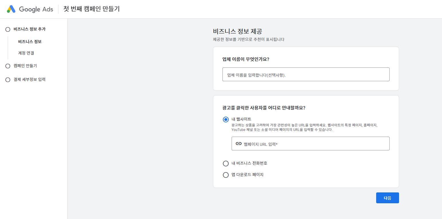 (1) 비즈니스 정보 제공에서 웹사이트, 전화번호, 페이지 등 하나를 선택하여 작성 후 다음으로 넘어갑니다.