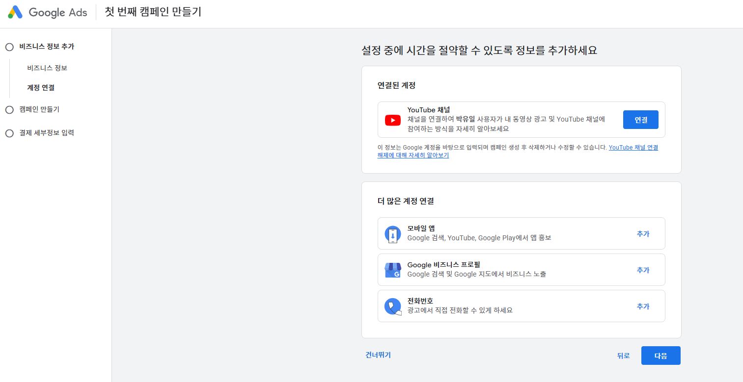 (2) 이후 계정연결, 캠페인 만들기는 모두 건너뛰기로 넘어갑니다.