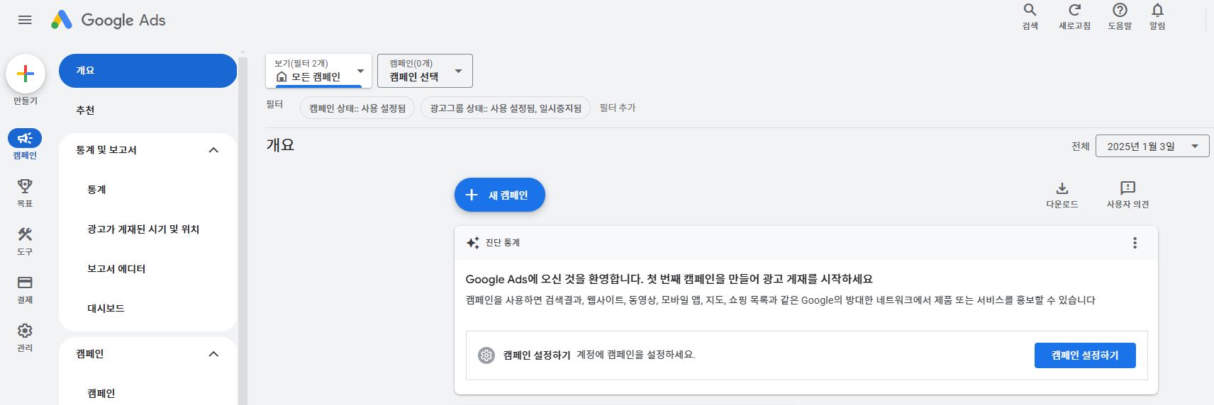 (4) 다시 접속하면 구글 애즈 접속되고 좌측에 메뉴가 보입니다.