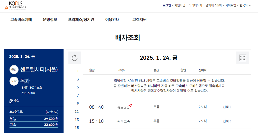 KTX나 SRT 보다는 시간적으로 불리하나 충분히 편안하게 교향길을 향할 수 있는 방법 중 하나이니 모두 놓치신 분들은 실시간으로 버스 예매 좌석을 확인하세요~!