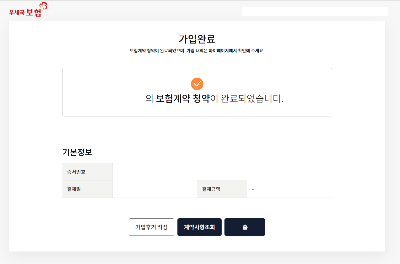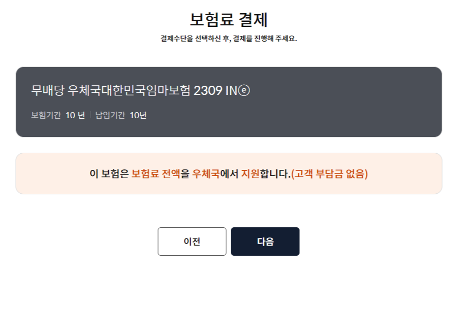 (5) 보험 청약내용 확인 후 보험료 결제 단계에서 모든 보험료는 우체국에서 전액 지원하는 것을 확인할 수 있습니다.