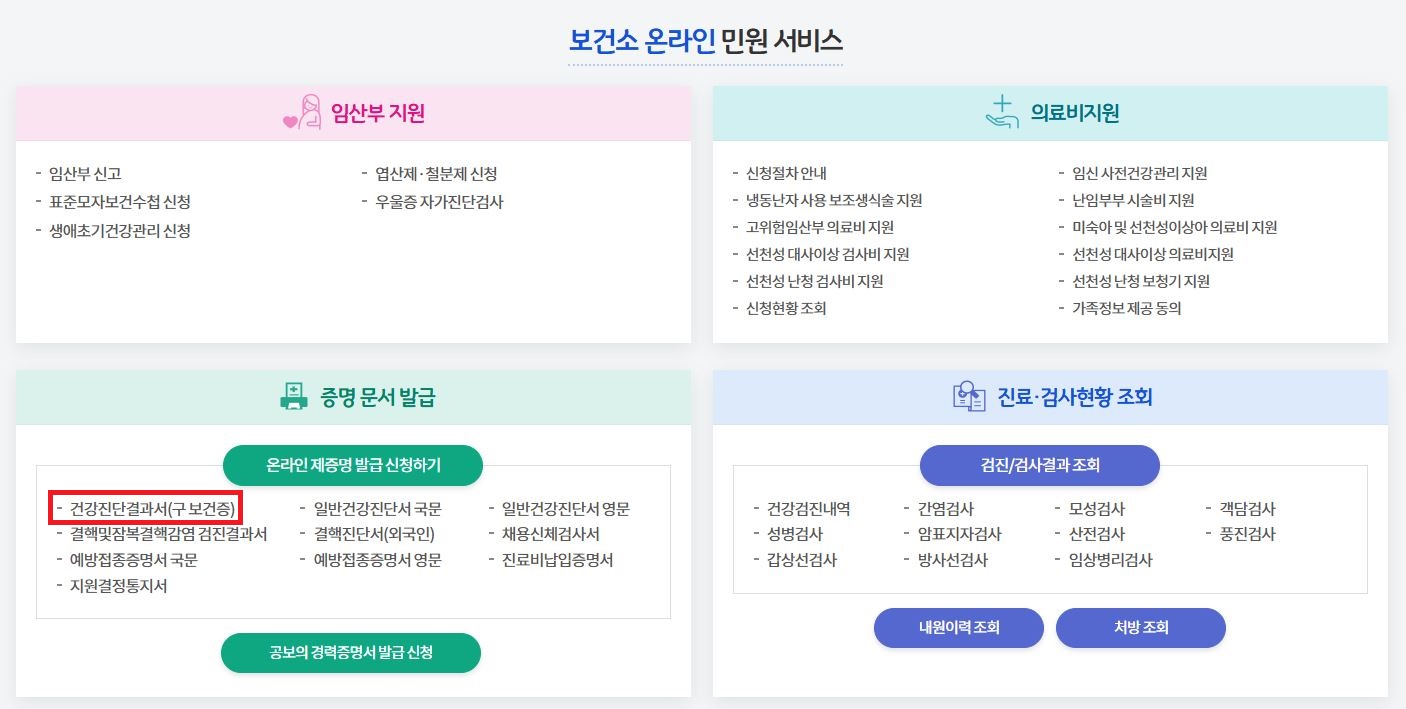 보건복지부와 한국사회보장정보원이 운영하는 온라인민원 서비스,건강진단결과서(구 보건증) 등 제증명 발급, 의료비지원 등 안내