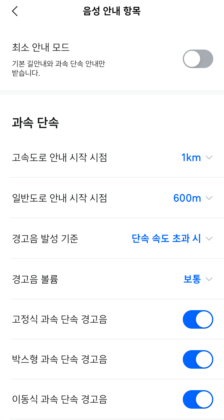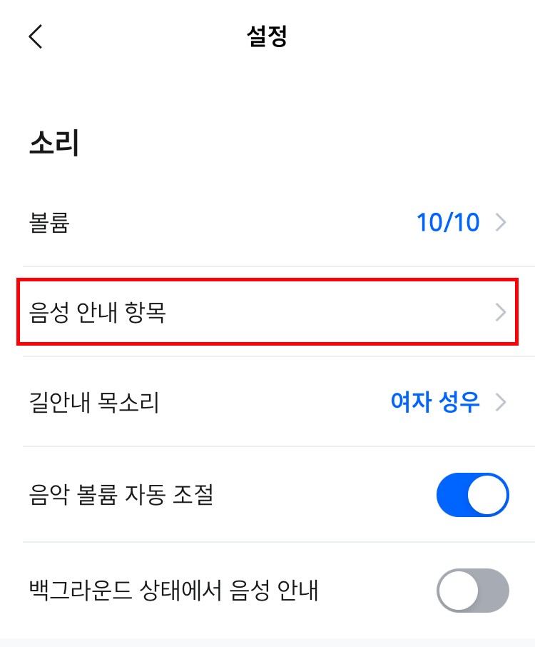 (4) 음성안내 항목으로 들어가면 기본세팅값인 최소안내모드를 해지하여 목록들을 확인합니다.