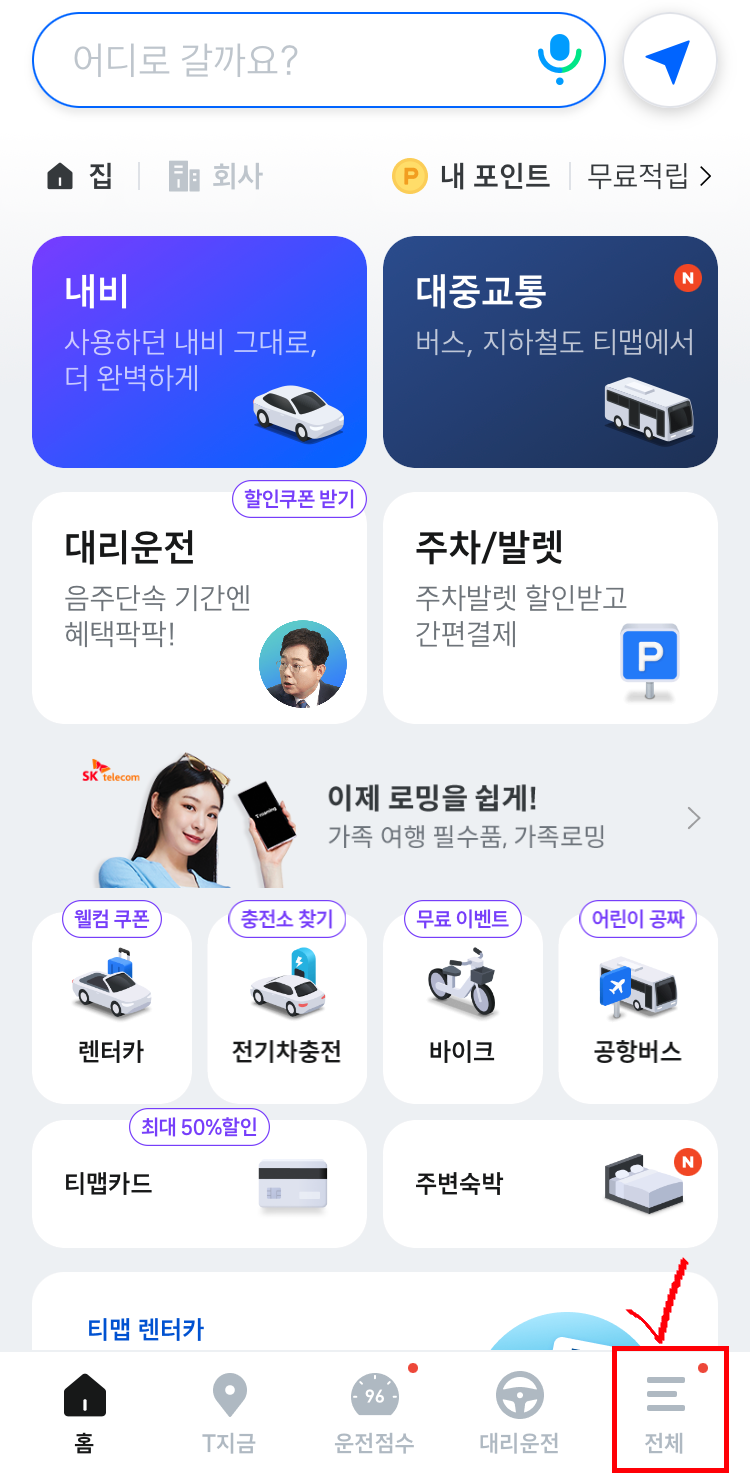 (1) 운전 시 많이 사용하고 있는 티맵을 다운로드하여 어플접속합니다.