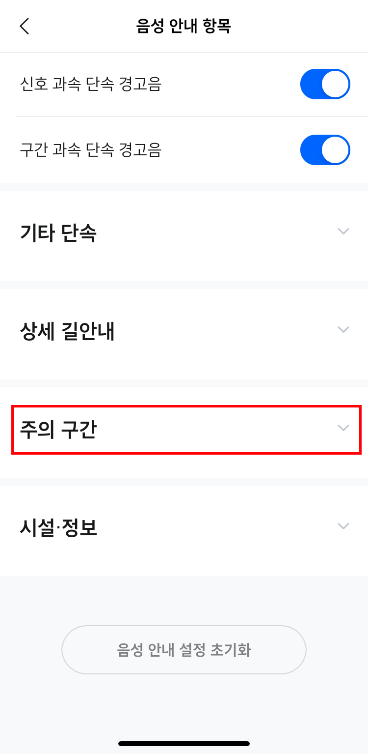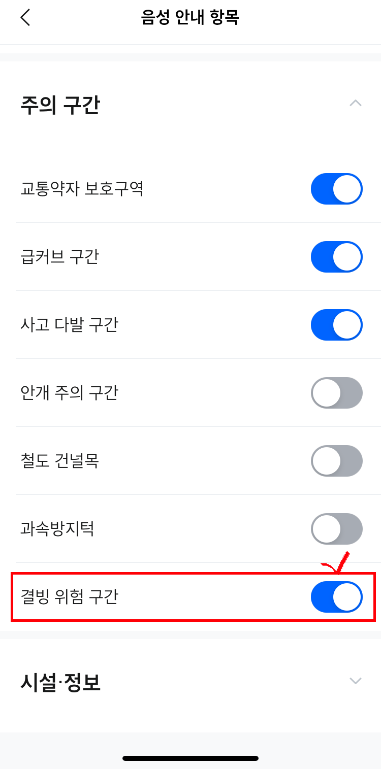 (5) 항목 하단의 주의구간으로 들어가서 결빙 위험 구간을 우측으로 표시해 주시면 운전 시 음성안내를 받으실 수 있습니다.