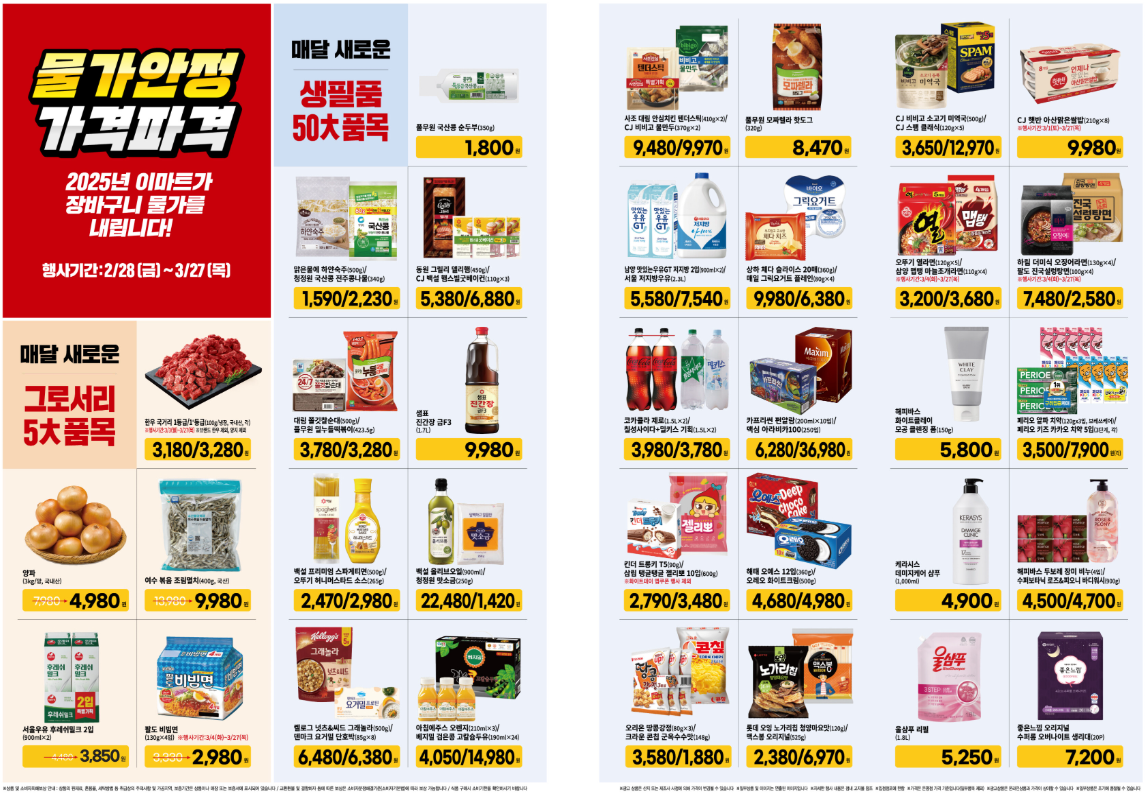 3월 5대 식료품 품목으로는 국거리고기, 양파, 멸치, 우유, 비빔면 할인 중이고,