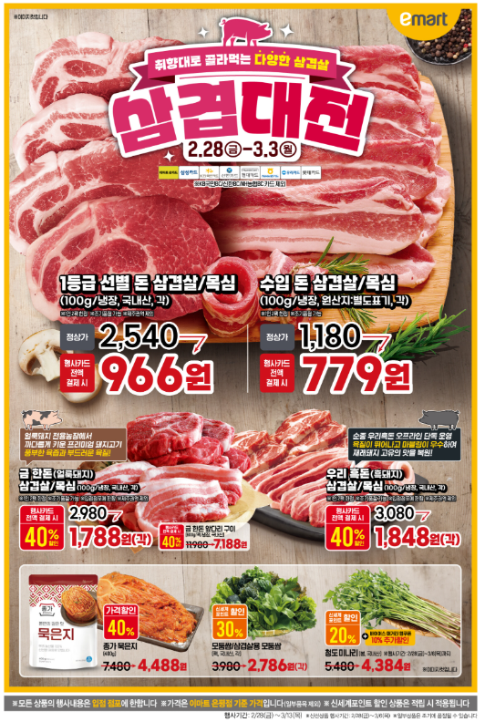 최근 전단품목으로 3.3일까지 삼겹대전으로 큰 폭의 고기류 할인이 있었습니다.