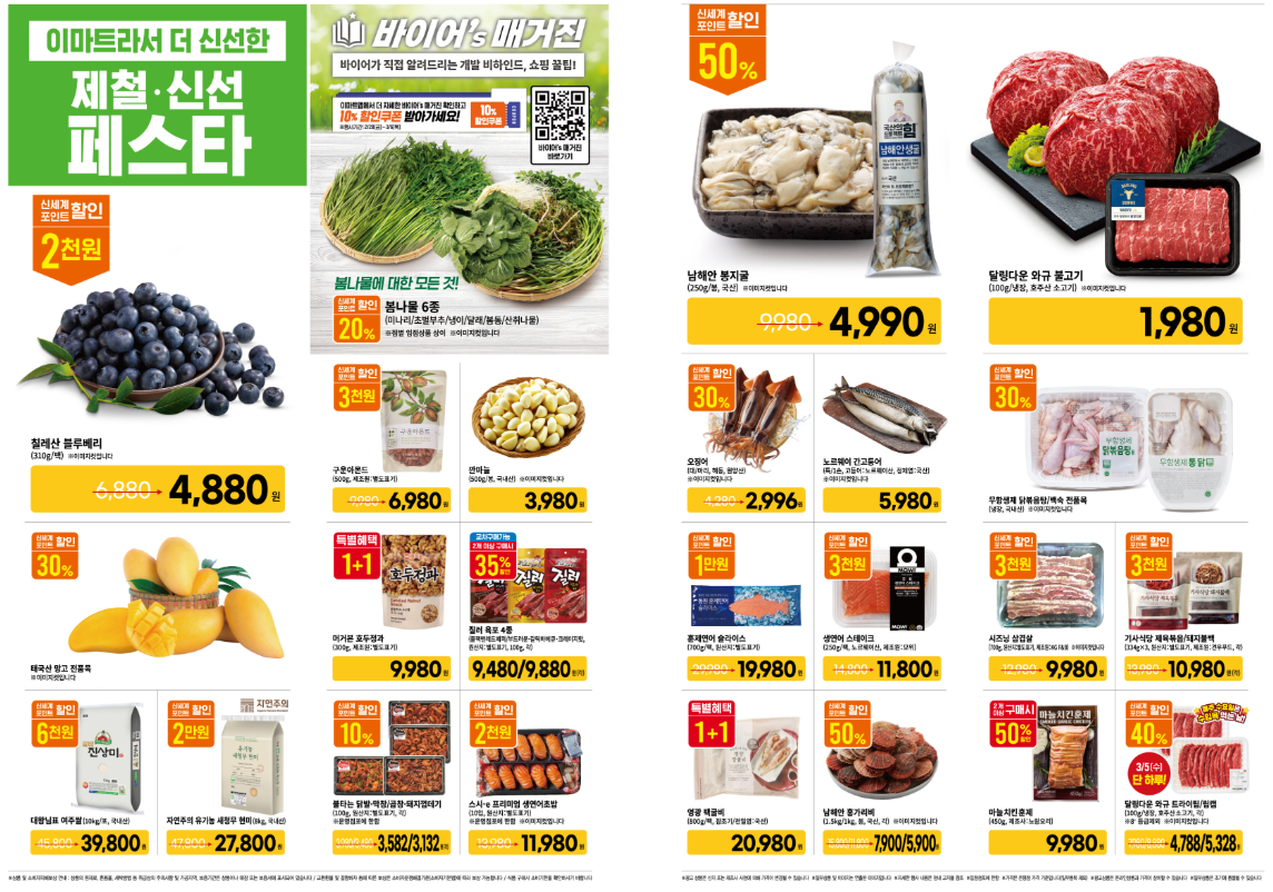 오늘은 3월을 맞이하여 이마트에서 진행하고 있는 할인상품 품목들을 확인해 보도록 하겠습니다.