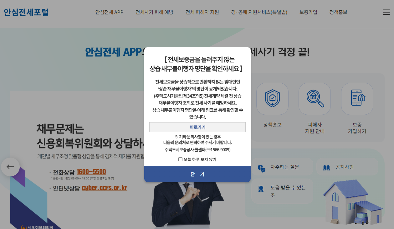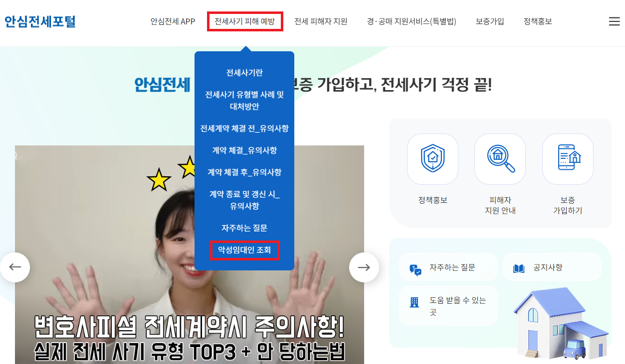 (3) 홈페이지에 접속하여 팝업을 통해 관련 메뉴로 접속 또는 상단의 전세사기 피해 예방 탭에서 맨 아래 악성임대인 조회메뉴를 확인할 수 있습니다.