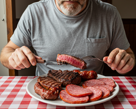 붉은 고기와 가공육(햄, 소시지 등)의 과다 섭취는 대장암 발병 위험을 증가시키는 요인 중 하나입니다. 반면, 대장 건강을 유지하는 데 중요한 식이섬유 섭취는 부족한 경우가 많습니다.