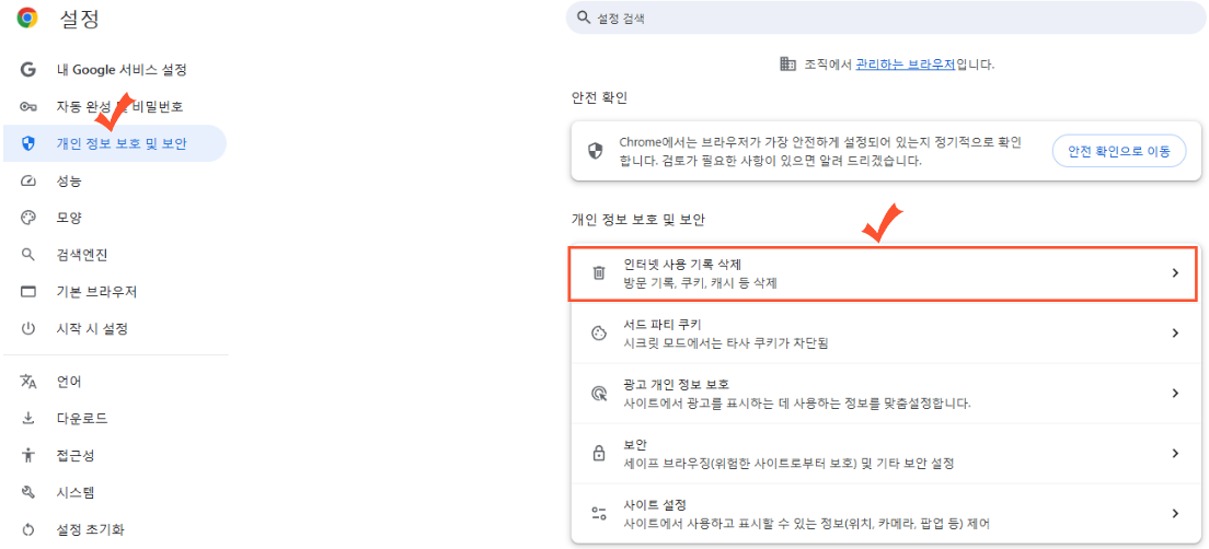 (2) 설정 좌측 메뉴 '개인 정보 보호 및 보안'에서 '인터넷 사용 기록 삭제'를 클릭합니다.