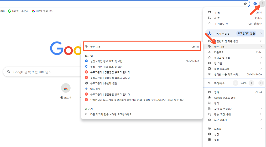 (1) 크롬 브라우저 실행 후 우측 상단의 점 3개 아이콘 클릭하여 메뉴 아래 '방문기록'으로 들어갑니다.