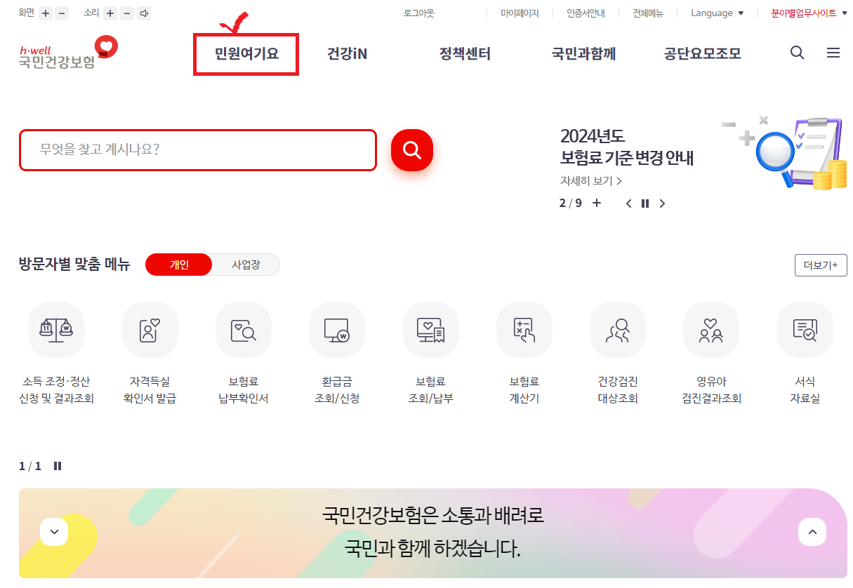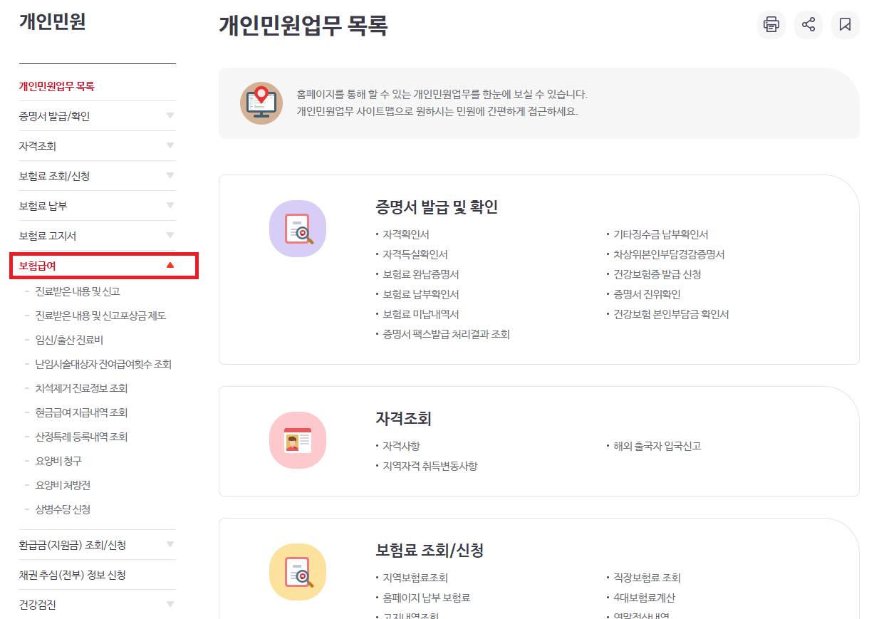 (4) 민원여기요 메뉴 중 개인민원을 선택하고 좌측 메뉴에서 보험급여를 클릭합니다.