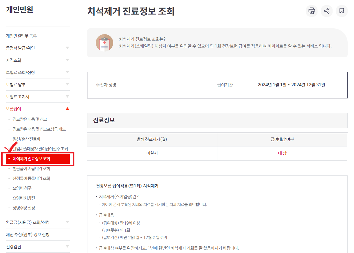 (5) 보험급여 메뉴를 확인해 보면 아래 치석제거 진료정보 조회를 확인할 수 있고 클릭하면 급여기간, 진료정보 등 조회가 가능합니다.