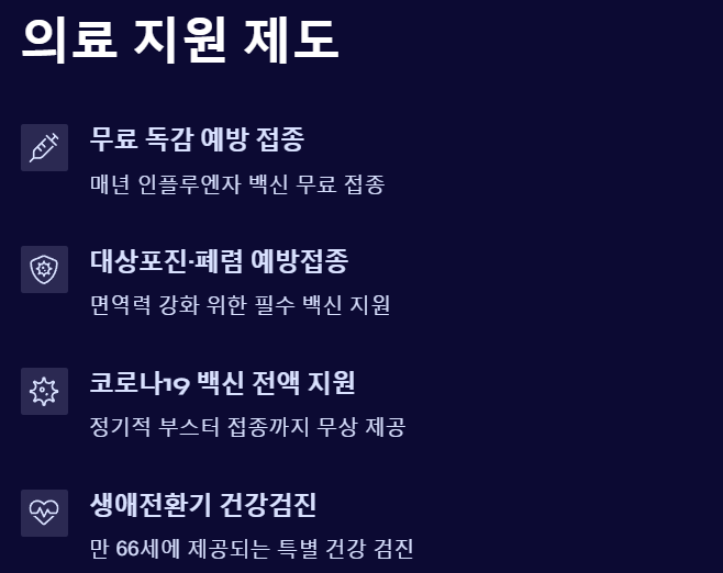 만 65세 이상이 되면 국가에서 제공하는 무료 또는 저렴한 의료 서비스가 대폭 확대됩니다.