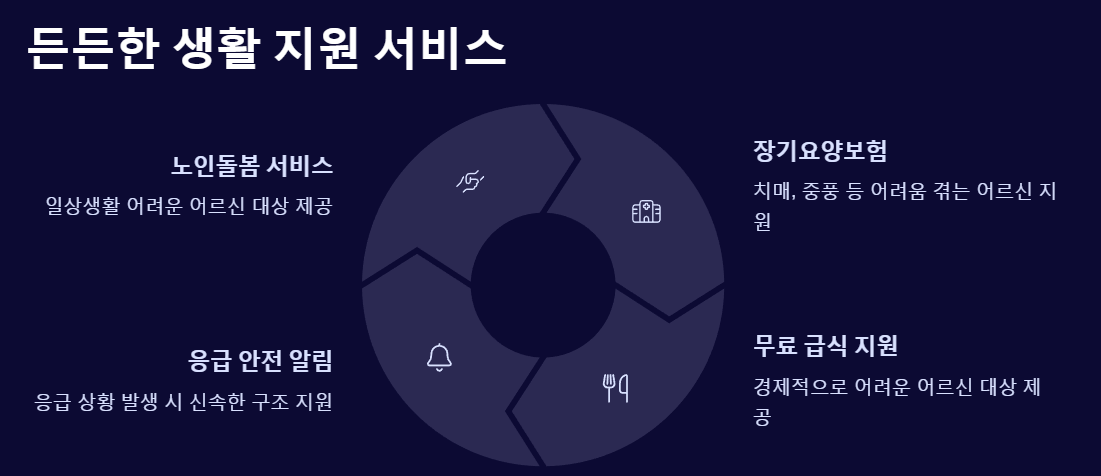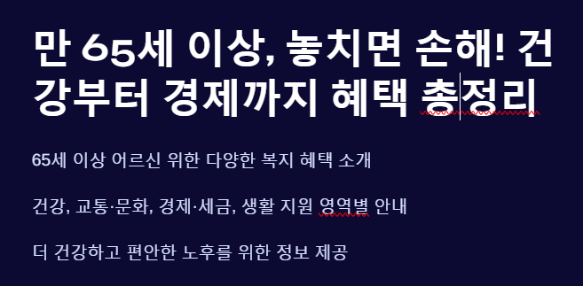 국가와 지자체에서는 만 65세 이상 어르신들을 위한 다양한 복지 제도를 마련하고 있어, 이 시기를 더욱 건강하고 편안하게 보낼 수 있는 발판이 됩니다.
