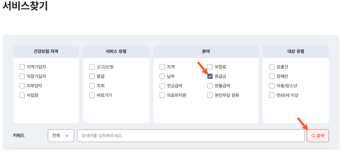 (4) 서비스 찾기 목록 중 '환급금'을 선택하여 검색합니다.
