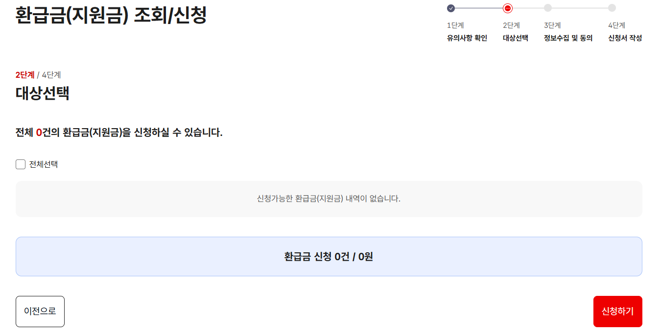 (6) 조회하여 환급가능한 목록이 보이신다면, 신청하기를 클릭하여 신청하시면 됩니다.