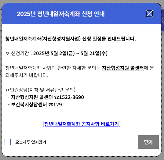2025년 기준, 5월 2일부터 5월 16일까지 신청 접수가 진행됩니다. 기간이 정해져 있고 연 단위로 모집하는 방식이기 때문에, 시기를 놓치면 1년을 기다려야 할 수도 있습니다. - 저축 기간과 조건