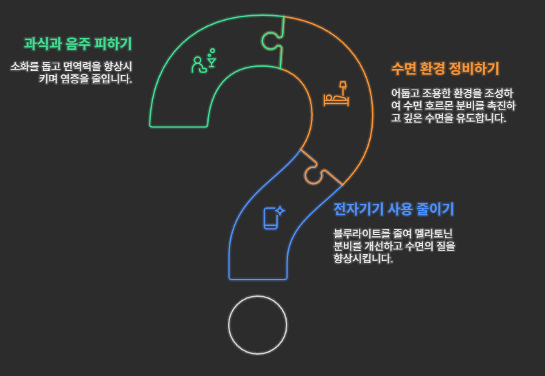 어두운 방, 적당한 온도, 조용한 분위기는 양질의 수면을 위해 꼭 필요합니다. 어둡고 조용한 환경은 수면 호르몬 분비를 도와주며, 불필요한 자극을 차단해 깊은 수면을 유도합니다. 반대로 조명이 켜진 상태에서 자는 습관은 수면 중에도 뇌가 완전히 휴식하지 못하게 만들어 피로가 누적될 수 있습니다.
